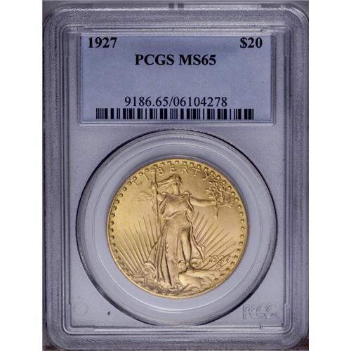 <B>1927<$20> MS65 PCGS.</B></I> A beautiful greenish-gold Gem that has strong claims to an even higher grade. The obverse field is uncommonly clean, and the devices are also well preserved.