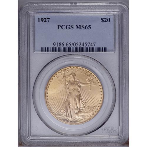 <B>1927<$20> MS65 PCGS.</B></I> A crisply struck and fully lustrous khaki-gold type coin. The obverse is magnificent preserved, and only a solitary horizontal mark at 10 o'clock on the reverse limits the grade.