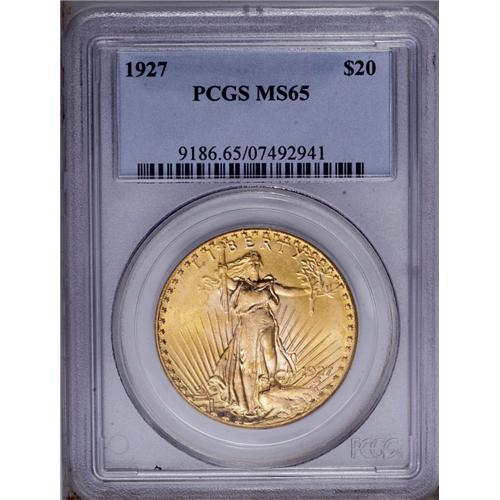 <B>1927<$20> MS65 PCGS.</B></I> A flashy two-tone Gem that would fit well in a date or type set. Lemon- and butter-yellow appear on the highly lustrous and clean surfaces.
