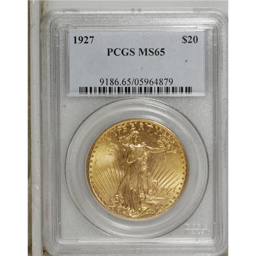 <B>1927 $20 MS65 PCGS.</B></I> A gorgeous gold type coin with relentlessly clean fields and original pale peach color. The eagle is also largely free from contact. A popular date from the collectible 1922 to 1928 Philadelphia run.<BR><BR><b>Shipping:</b> Coins & Currency (<a target="_blank" href="http://www.heritageauctions.com/common/shipping.php">view shipping information</a>)