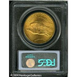 1927 $20 MS65 PCGS. A highly lustrous lemon-gold G <B>1927 $20 MS65 PCGS.</B></I> A highly lustrous lemon-gold Gem with a bold strike and beautifully preserved fields. A lovely survivor of the great gold recall of 1933. <BR><BR><B>Important notice:</B> Heritage usually auctions material at the rate of 200-250 lots per hour. On some occasions eBay Live bid software or the Internet may not be able to keep up with the pace of the auction. We recommend placing a realistic absentee bid now as insurance to avoid disappointment. Occasionally the auctioneer may eliminate or reject an eBay Live bid, and the auctioneer may also reopen a lot after the close of the eBay live bidding (usually because we missed an audience bid), and may reject your bid even if it shows you as the winning bidder. By bidding via eBay Live, you agree that Heritage may award the lot to another bidder at its sole discretion under the circumstances described above or any other reasonable circumstances. Since eBay bids are not shown to us until we open the lot on the floor, we treat those bids just like floor bids. In most cases the floor responds before the eBay bid is presented to us, due to Internet lag time, so for consistency we have made it a policy that floor bids are always considered first over tie eBay live bids. Also please note that all Heritage lots purchased through eBay Live carry a 20% Buyer's Premium. Please make sure you read the Terms and Conditions before you bid. This lot is being auctioned in conjunction with a live floor auction by Heritage Galleries & Auctioneers. All final auction and invoice information will be supplied by Heritage Galleries & Auctioneers, and all other information should be considered preliminary. Lot:7254