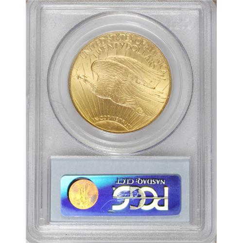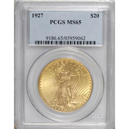 <B>1927 $20 MS65 PCGS.</B></I> A lovely apricot-gold example of this perennial favorite of type collectors. Minimally marked and solidly detailed with low-key, pleasing luster and a triangular copper spot above and between STATES OF on the reverse.<BR><BR><b>Shipping:</b> Coins & Currency (<a target="_blank" href="http://www.heritageauctions.com/common/shipping.php">view shipping information</a>)