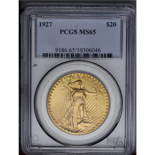 <B>1927<$20> MS65 PCGS.</B></I> A lovely coin with satiny luster and orange-yellow surfaces with minimal marks. This piece has great overall eye appeal and would fit well with a type set.