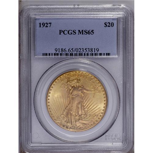 <B>1927 $20  MS65 PCGS.</B></I> A lustrous Gem that has bright yellow-green fields and rose-gold devices. Nearly pristine except for a couple of minor abrasions.