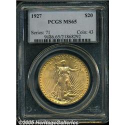 <B>1927 $20 MS65 PCGS.</B></I> An imposing type coin that possesses original tan-gold color and has undisturbed cartwheel shimmer. The obverse fields are particularly free from contact.