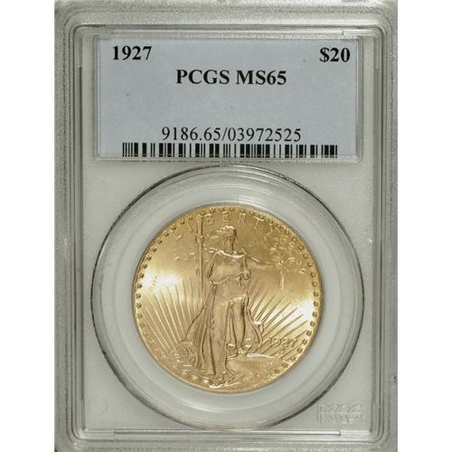 <B>1927 $20 MS65 PCGS.</B></I> Booming luster brightens this sharply struck and attractively preserved Gem. The reverse is particularly smooth. A quality 20th century gold type coin.<BR><BR><b>Shipping:</b> Coins & Currency (<a target="_blank" href="http://www.heritageauctions.com/common/shipping.php">view shipping information</a>)