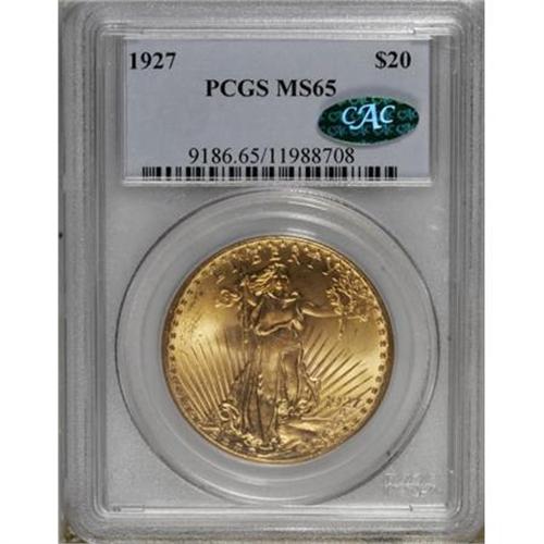 <B>1927 $20 MS65 PCGS. CAC.</B></I> Radiant peach-gold patina invigorates this highly lustrous Saint-Gaudens gold type coin. The strike is good, and even careful inspection locates only minor marks.<BR><BR><B>Coin Engraver:</B> Augustus Saint-Gaudens<BR><BR><b>Shipping:</b> Coins & Currency (<a target="_blank" href="http://www.heritageauctions.com/common/shipping.php">view shipping information</a>)