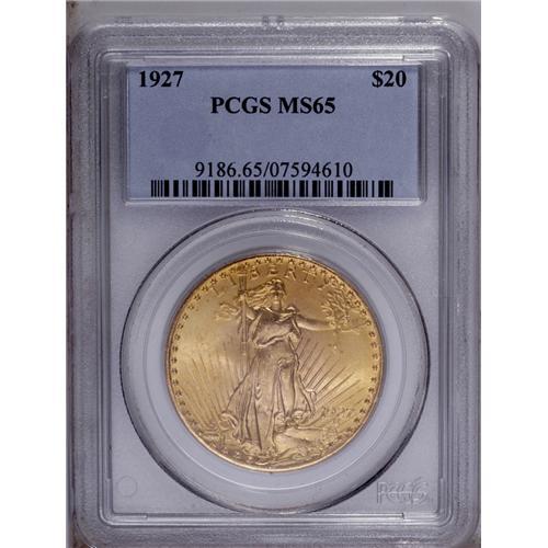 <B>1927 $20 MS65 PCGS.</B></I> Lovely reddish-gold color complements a bold strike and coruscating luster on this coin. The strike on the eagle is especially bold, and the reverse is choice for the grade.