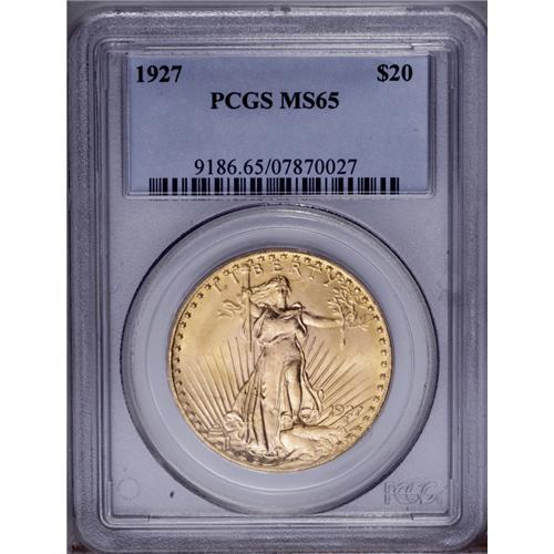 <B>1927<$20> MS65 PCGS.</B></I> Radiant luster is emitted from peach-gold surfaces that display sharply struck devices. A few minute marks on Liberty's head and breast and on the eagle's left wing are mentioned for accuracy.