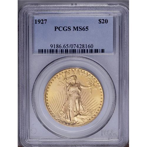 <B>1927<$20> MS65 PCGS.</B></I> This apricot-gold Saint-Gaudens twenty is intricately struck on the Capitol building and Liberty's face. The few detectable marks are unobtrusively placed, and the open fields are unusually smooth.