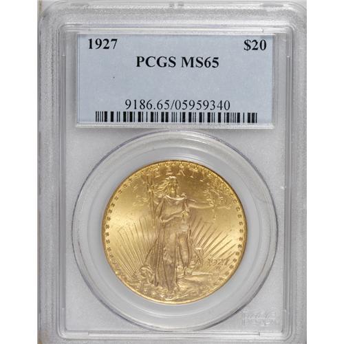 <B>1927 $20 MS65 PCGS.</B></I> This pleasing gold type coin has undiminished cartwheel sheen, and the evenly struck motifs lack consequential marks. The reverse is delightfully smooth, and the obverse has only a few wispy grazes.<BR><BR><b>Shipping:</b> Coins & Currency (<a target="_blank" href="http://www.heritageauctions.com/common/shipping.php">view shipping information</a>)
