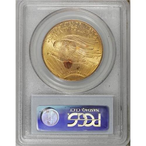 <B>1927 $20 MS65 PCGS.</B></I> A lustrous and well-defined Gem representative of this ever-present later double eagle issue, predominantly yellow-orange with areas of ruby copper spotting. Small dots appear in the left and right obverse fields, while the reverse has a sizable patch just below the eagle's breast.<BR><BR><b>Shipping:</b> Coins & Currency (<a target="_blank" href="http://www.heritageauctions.com/common/shipping.php">view shipping information</a>)