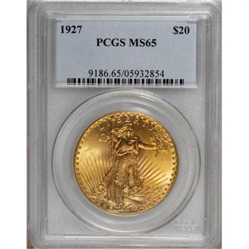 <B>1927 $20 MS65 PCGS.</B></I> Though several issues have higher mintages, the 1927 has become the type issue of choice for many collectors. This vibrant yellow-orange Gem has the strong visual appeal that makes the date so prized, with strong detail, vivid color, and exemplary luster.<BR><BR><b>Shipping:</b> Coins & Currency (<a target="_blank" href="http://www.heritageauctions.com/common/shipping.php">view shipping information</a>)