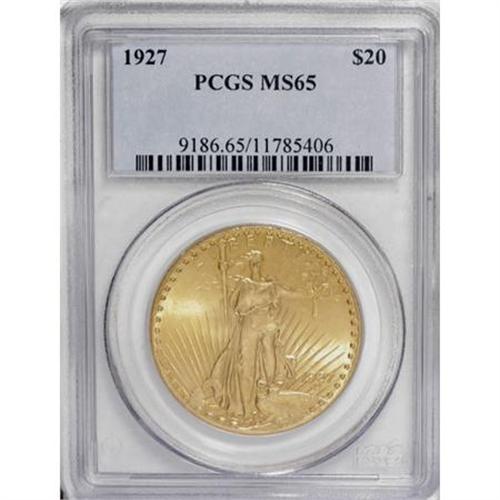 <B>1927 $20 MS65 PCGS.</B></I> PCGS Population (16635/4475). NGC Census: (15891/1715). Mintage: 2,946,750. Numismedia Wsl. Price for NGC/PCGS coin in MS65: $1,230. (#9186)<BR><BR><B>Coin Engraver:</B> Augustus Saint-Gaudens<BR><BR><b>Shipping:</b> Coins & Currency (<a target="_blank" href="http://www.heritageauctions.com/common/shipping.php">view shipping information</a>\)