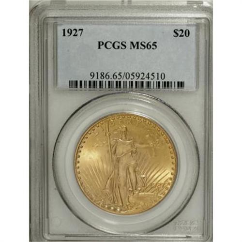 <B>1927 $20 MS65 PCGS.</B></I> Pleasing luster adorns the peach-gold surfaces of this Saint-Gaudens twenty dollar. The well executed strike is evident in the delineation on the Capitol dome, Liberty's facial features, fingers, and toes, and the eagle's plumage.<BR><BR><B>Coin Engraver:</B> Augustus Saint-Gaudens<BR><BR><b>Shipping:</b> Coins & Currency (<a target="_blank" href="http://www.heritageauctions.com/common/shipping.php">view shipping information</a>)