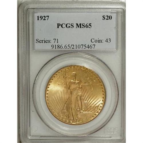 <B>1927 $20 MS65 PCGS.</B></I> From one of the better-produced issues in the Saint-Gaudens series, this Gem presents boldly struck design elements and pleasing luster that highlights the lovely mint-green and rose-gold coloration. A few small marks are noted that do not seem excessive for the grade. <BR><BR><B>Coin Engraver:</B> Augustus Saint-Gaudens<BR><BR><b>Shipping:</b> Coins & Currency (<a target="_blank" href="http://www.heritageauctions.com/common/shipping.php">view shipping information</a>)