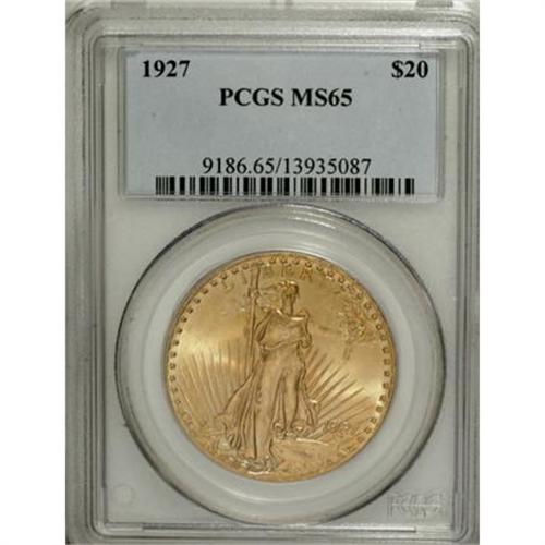 <B>1927 $20 MS65 PCGS.</B></I> A whisper of frost visits the highpoints of this type Gem, and the apricot-gold fields display this issue's strong luster. Suitably detailed with few marks for the grade assigned.<BR><BR><B>Coin Engraver:</B> Augustus Saint-Gaudens<BR><BR><b>Shipping:</b> Coins & Currency (<a target="_blank" href="http://www.heritageauctions.com/common/shipping.php">view shipping information</a>)