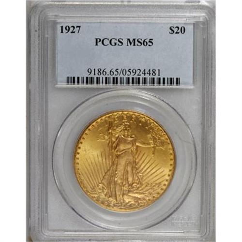 <B>1927 $20 MS65 PCGS.</B></I> PCGS Population (17474/4617). NGC Census: (15993/1764). Mintage: 2,946,750. Numismedia Wsl. Price for NGC/PCGS coin in MS65: $1,220. (#9186)<BR><BR><B>Coin Engraver:</B> Augustus Saint-Gaudens<BR><BR><b>Shipping:</b> Coins & Currency (<a target="_blank" href="http://www.heritageauctions.com/common/shipping.php">view shipping information</a>)