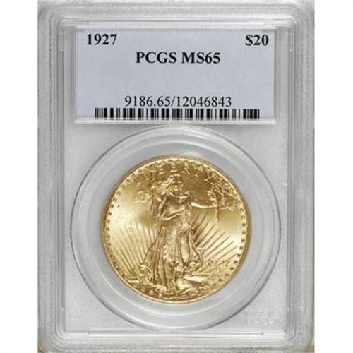 <B>1927 $20 MS65 PCGS.</B></I> Solidly struck with vibrant luster, a lovely Gem example of this ever-popular Saint-Gaudens type issue. A shallow depression is noted on Liberty's left (facing) leg.<BR><BR><B>Coin Engraver:</B> Augustus Saint-Gaudens<BR><BR><b>Shipping:</b> Coins & Currency (<a target="_blank" href="http://www.heritageauctions.com/common/shipping.php">view shipping information</a>)