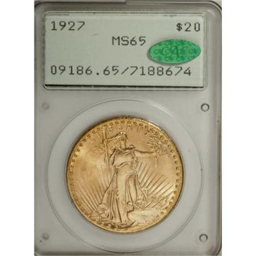 <B>1927 $20 MS65 PCGS. CAC.</B></I> This solidly struck Gem has bold definition and intense luster. The overall preservation is excellent, though a small mark is noted on Liberty's right (facing) shin. The pale golden surfaces contribute to the excellent overall eye appeal.<BR><BR><B>Coin Engraver:</B> Augustus Saint-Gaudens<BR><BR><b>Shipping:</b> Coins & Currency (<a target="_blank" href="http://www.heritageauctions.com/common/shipping.php">view shipping information</a>)