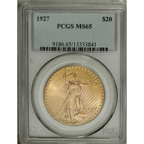 <B>1927 $20 MS65 PCGS.</B></I> PCGS Population (18257/4698). NGC Census: (16159/1808). Mintage: 2,946,750. Numismedia Wsl. Price for NGC/PCGS coin in MS65: $1,220. (#9186)<BR><BR><B>Coin Engraver:</B> Augustus Saint-Gaudens<BR><BR><b>Shipping:</b> Coins & Currency (<a target="_blank" href="http://www.heritageauctions.com/common/shipping.php">view shipping information</a>)