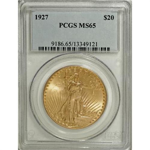 <B>1927 $20 MS65 PCGS.</B></I> PCGS Population (18244/4697). NGC Census: (16159/1808). Mintage: 2,946,750. Numismedia Wsl. Price for NGC/PCGS coin in MS65: $1,220. (#9186)<BR><BR><B>Coin Engraver:</B> Augustus Saint-Gaudens<BR><BR><b>Shipping:</b> Coins & Currency (<a target="_blank" href="http://www.heritageauctions.com/common/shipping.php">view shipping information</a>)