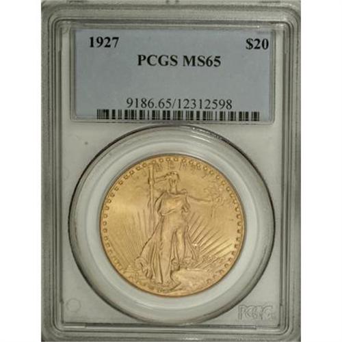<B>1927 $20 MS65 PCGS.</B></I> PCGS Population (19427/4765). NGC Census: (16396/1863). Mintage: 2,946,750. Numismedia Wsl. Price for NGC/PCGS coin in MS65: $1,490. (#9186)<BR><BR><B>Coin Engraver:</B> Augustus Saint-Gaudens<BR><BR><b>Shipping:</b> Coins & Currency (<a target="_blank" href="http://www.heritageauctions.com/common/shipping.php">view shipping information</a>)