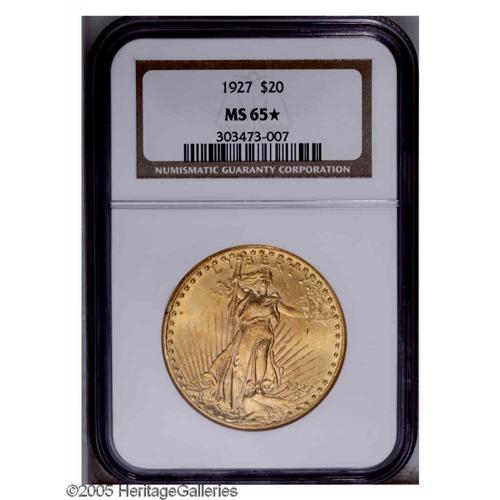 <B>1927<$20> MS65 <S NGC.</B></I> Unusually clean, even for an MS65, the original reddish-gold color has taken on a slight overlay of lemon patina. Sharply defined as well.