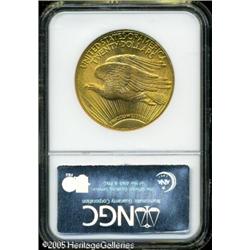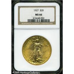 <B>1927 $20 MS66 NGC.</B></I> A splendid example of this plentiful date in simply outstanding condition. Examination of the surfaces finds only the tiniest ticks, and the luster is full and unbroken. Well struck as usual for this date. A wonderful type or date collectors coin that shows all the design elements, and is far better preserved than usually encountered. Curiously, this is about as nice as this date is ever found, with just 14 coins seen in higher grades by NGC, but 1,256 have been graded similarly to this example of this date. Lot:9746