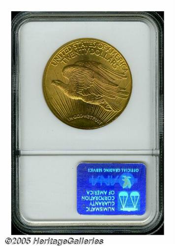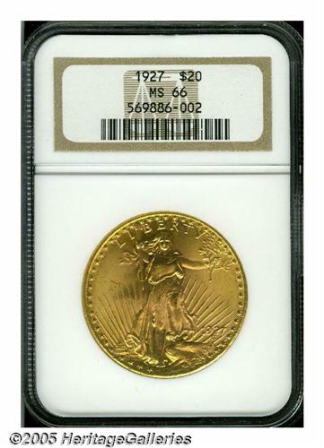 <B>1927<$20> MS66 NGC.</B></I> Attractive satiny luster. The eagle's breast, wing, and tail feathers all show bold definition. The 1927 ranks as a popular issue that's encountered in Gem condition frequently enough to be a great favorite with type collectors.