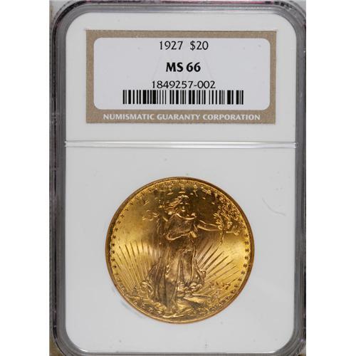 <B>1927 $20 MS66 NGC.</B></I> Ebullient luster and lovely orange and aqua toning ensure the eye appeal of this collectible gold type coin. The reverse field is remarkably clean, and the obverse has only inconsequential grazes.<BR><BR><b>Shipping:</b> Coins & Currency (<a target="_blank" href="http://www.heritageauctions.com/common/shipping.php">view shipping information</a>)