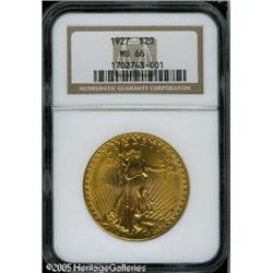 <B>1927 $20 MS66 NGC.</B></I> Satiny surfaces reveal soft, glowing luster beneath a uniform layer of golden-orange patina. The design elements are sharply impressed, and there are no significant abrasions to report. Lot:9747