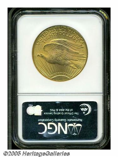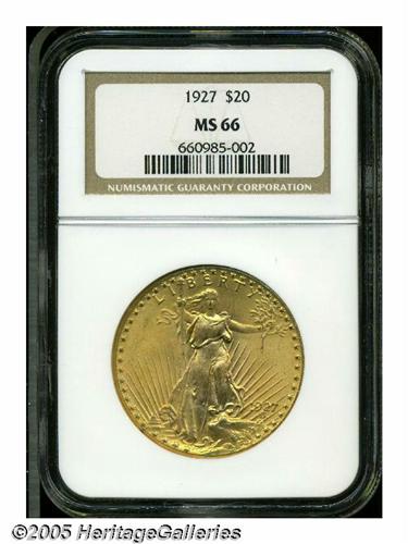 <B>1927<$20> MS66 NGC.</B></I> Silky smooth and satiny, with a soft frosted appearance over the major design elements. Remnants of grease on the dies angle across Liberty's skirt and legs, light enough to only be visible under magnification.