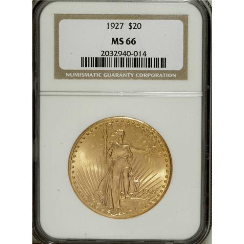 <B>1927 $20 MS66 NGC.</B></I> The design features on this lovely piece are sharply impressed, and the satiny peach-gold surfaces radiate pleasing luster. A wonderful example of this popular type issue.<BR><BR><b>Shipping:</b> Coins & Currency (<a target="_blank" href="http://www.heritageauctions.com/common/shipping.php">view shipping information</a>)