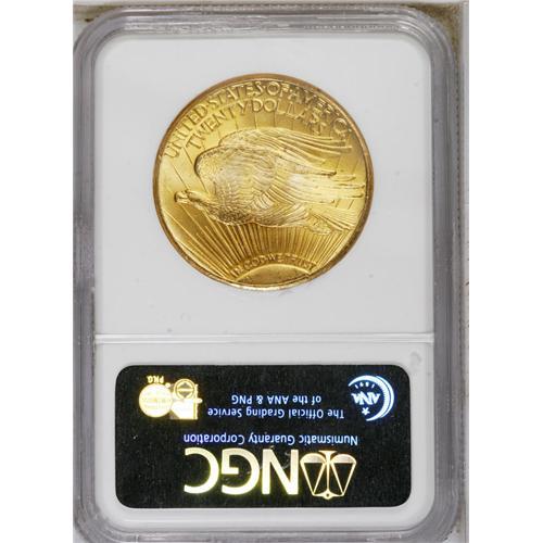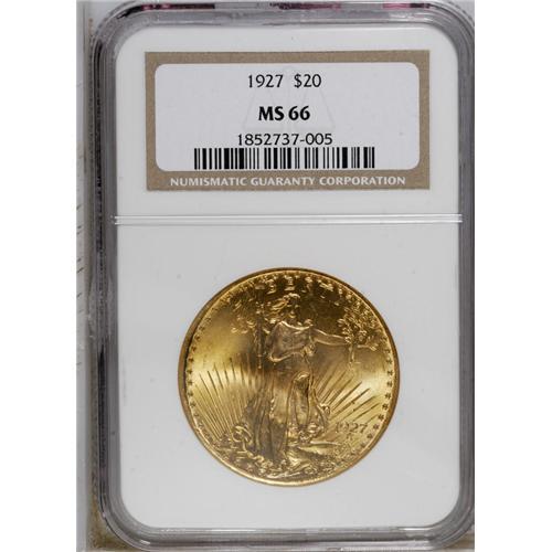 <B>1927 $20 MS66 NGC.</B></I> The rich orange-gold surfaces have luster to match. Boldly struck with minimal marks and a few scattered copper spots on the reverse. NGC has certified a mere 27 coins finer (9/06).<BR><BR><b>Shipping:</b> Coin/Currency (<a target="_blank" href="http://www.heritageauctions.com/common/shipping.php">view shipping information</a>)