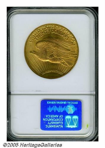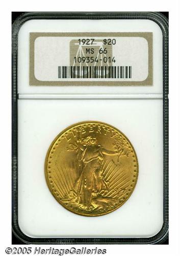 <B>1927<$20> MS66 NGC.</B></I> Uncommonly abrasion-free for the series, both sides display a smooth, satiny sheen and boldly defined features. Attractive orange-gold toning decorates each side.
