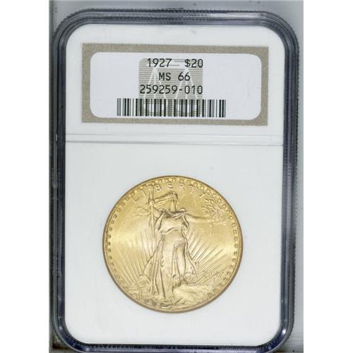 <B>1927<$20> MS66 NGC.</B></I> Unusually deep orange-gold coloration is highlighted by intense satiny luster on each side of this impressive Premium Gem. An uncommonly attractive example of this common date double eagle. Likely destined for a type collection with emphasis on eye appeal.