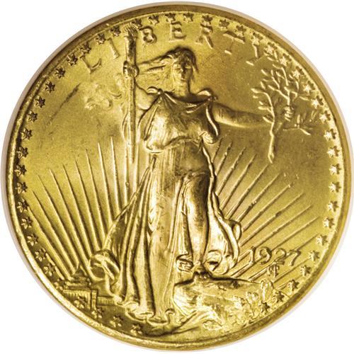 <B>1927 $20 MS66 NGC.</B></I> Unusually deep orange-gold coloration is highlighted by intense satiny luster on each side of this impressive Premium Gem. An uncommonly attractive example of this common date double eagle. Likely destined for a type collection with emphasis on eye appeal. This issue becomes extremely elusive above MS66.<BR><BR><b>Shipping:</b> Coins & Currency (<a target="_blank" href="http://www.heritageauctions.com/common/shipping.php">view shipping information</a>)