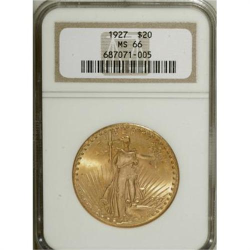 <B>1927 $20 MS66 NGC.</B></I> While not particularly scarce in Premium Gem quality, this date is a major condition rarity in Superb preservation. Both sides have soft, frosty honey-gold luster with pristine surfaces.<BR><BR><b>Shipping:</b> Coins & Currency (<a target="_blank" href="http://www.heritageauctions.com/common/shipping.php">view shipping information</a>)