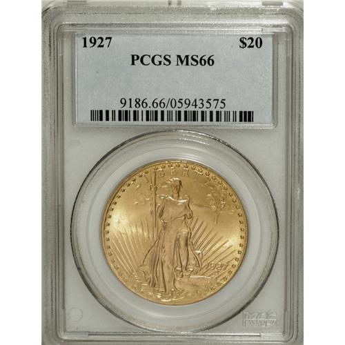 <B>1927 $20 MS66 PCGS.</B></I> A shining apricot-gold representative of this desirable type issue, distinctly finer than the usual Gem. Well-defined with highly lustrous surfaces and only one mark of any significance, which appears just above the eagle's wing. PCGS has graded only 12 pieces finer (4/07).<BR><BR><b>Shipping:</b> Coins & Currency (<a target="_blank" href="http://www.heritageauctions.com/common/shipping.php">view shipping information</a>)