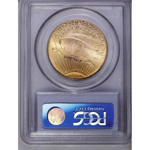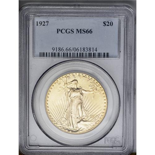 <B>1927<$20> MS66 PCGS.</B></I> Essentially pristine and potently lustrous, with delightful medium yellow-gold color and superb eye appeal. Even under a glass, this lovely piece reveals no singularly mentionable distractions of any kind. Fortunately for collectors of Saint-Gaudens' gold designs, the generous production runs of several 1920s P-mint issues ensured a supply of these phenomenal Premium Gem examples. PCGS has graded only 12 pieces finer (6/06).