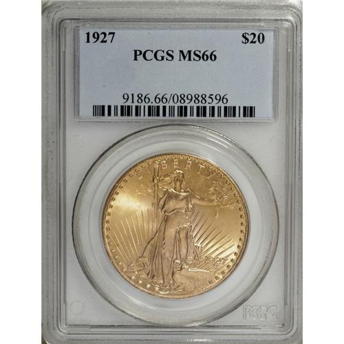 <B>1927 $20 MS66 PCGS.</B></I> Rich blended apricot and green-gold toning dominates this crisply struck and thoroughly lustrous Saint-Gaudens twenty. A few minor obverse field grazes do not affect the eye appeal. PCGS has only certified 12 finer examples (11/06).<BR><BR><b>Shipping:</b> Coin/Currency (<a target="_blank" href="http://www.heritageauctions.com/common/shipping.php">view shipping information</a>)