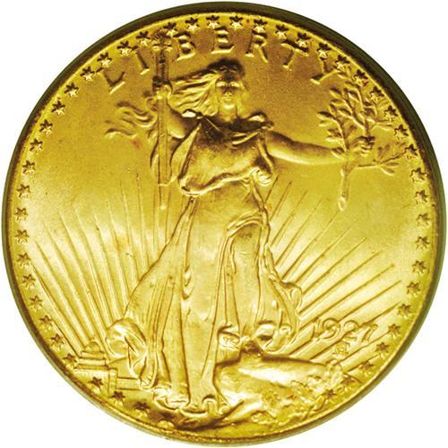 <B>1927<$20> MS66 PCGS.</B></I> The 1927 double eagle is very plentiful in Mint State, up through the MS66 grade level. This Premium Gem displays apricot-gold patina and pleasing luster, with a few orange toning spots on each side. The design features are well impressed, and the surfaces are devoid of significant abrasions. A few trivial marks are noted on the rims.