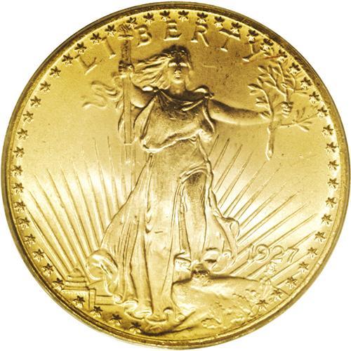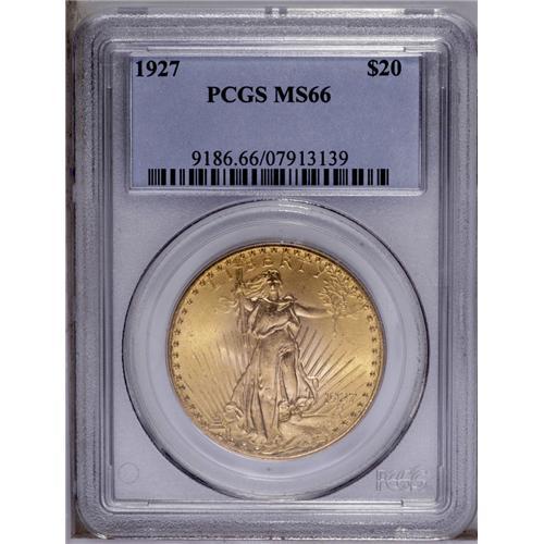<B>1927<$20> MS66 PCGS.</B></I> The 1927 is among a select group of P-mint issues from the 1920s whose surviving specimens can be found in Gem and higher grades with any regularity. This Premium Gem coin shows pretty cartwheel luster over copper-gold surfaces. Despite a couple of ticks on Liberty's legs, most of the coin is essentially pristine and mark-free. Nearly unimprovable quality, as PCGS has graded only 12 specimens at the Superb Gem level (3/06). <BR><BR><B>Important notice:</B> Heritage usually auctions material at the rate of 200-250 lots per hour. On some occasions eBay Live bid software or the Internet may not be able to keep up with the pace of the auction. We recommend placing a realistic absentee bid now as insurance to avoid disappointment. Occasionally the auctioneer may eliminate or reject an eBay Live bid, and the auctioneer may also reopen a lot after the close of the eBay live bidding (usually because we missed an audience bid), and may reject your bid even if it shows you as the winning bidder. By bidding via eBay Live, you agree that Heritage may award the lot to another bidder at its sole discretion under the circumstances described above or any other reasonable circumstances. Since eBay bids are not shown to us until we open the lot on the floor, we treat those bids just like floor bids. In most cases the floor responds before the eBay bid is presented to us, due to Internet lag time, so for consistency we have made it a policy that floor bids are always considered first over tie eBay live bids. Also please note that all Heritage lots purchased through eBay Live carry a 20% Buyer's Premium. Please make sure you read the Terms and Conditions before you bid. This lot is being auctioned in conjunction with a live floor auction by Heritage Galleries & Auctioneers. All final auction and invoice information will be supplied by Heritage Galleries & Auctioneers, and all other information should be considered preliminary. Lot:4744 <BR><BR><B>Winning Notification and Billing:</B> After the FINAL session in this auction is complete, Heritage will send e-mail and snail mail invoices. This process normally takes several days. All final auction and invoice information will be supplied by Heritage Galleries & Auctioneers, and all other information should be considered preliminary. <BR><BR>This auction will be conducted on a live auction floor and over the Internet through eBay Live. If you choose to place an absentee bid, please take a moment to <font color='#0000ff'><u><a href='http://pages.ebay.com/liveauctions/help/before/laabsentee.html'>learn how eBay Live absentee bidding works</a></u></font><font color='#000000'>
