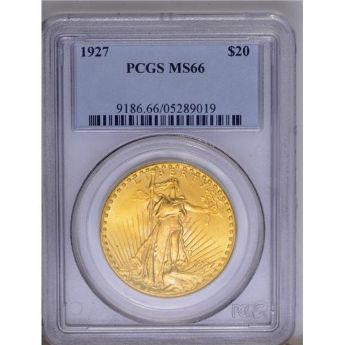 <B>1927<$20> MS66 PCGS.</B></I> The ebullient luster and beautiful reddish-gold patina boost this example above the norm for this "common" date. A boldly struck example, this coin shows a few light, grade-consistent ticks about Liberty's torso, with few quibbles otherwise. PCGS has graded only 12 examples finer (7/06).