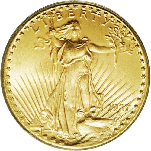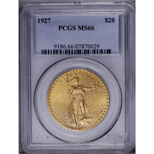 <B>1927<$20> MS66 PCGS.</B></I> This example represents one of the five most common double eagle issues, the P-mint coins from 1924 to 1928. Sharply struck and fully lustrous with satiny yellow-gold surfaces. A wonderful coin for the specialist or type collector.