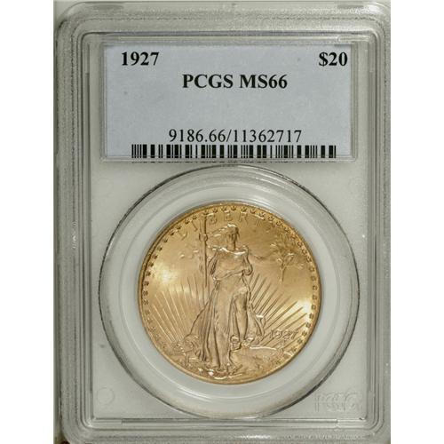 <B>1927 $20 MS66 PCGS.</B></I> Well struck and highly appealing with shining yellow-gold and straw-gold surfaces. Aside from a cluster of tiny marks on the sun, the surfaces are essentially flawless.<BR><BR><b>Shipping:</b> Coins & Currency (<a target="_blank" href="http://www.heritageauctions.com/common/shipping.php">view shipping information</a>)