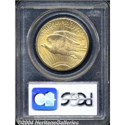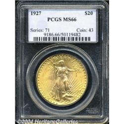 <B>1927<$20> MS66 PCGS.</B></I> Satiny surfaces reveal a soft, glowing luster beneath a uniform layer of pumpkin-orange patina. The design elements are sharply impressed, and there are no significant abrasions to report. <BR><BR><B>Important notice:</B> Heritage usually auctions material at the rate of 200-250 lots per hour. On some occasions eBay Live bid software or the Internet may not be able to keep up with the pace of the auction. We recommend placing a realistic absentee bid now as insurance to avoid disappointment. Occasionally the auctioneer may eliminate or reject an eBay Live bid, and the auctioneer may also reopen a lot after the close of the eBay live bidding (usually because we missed an audience bid), and may reject your bid even if it shows you as the winning bidder. By bidding via eBay Live, you agree that Heritage may award the lot to another bidder at its sole discretion under the circumstances described above or any other reasonable circumstances. Since eBay bids are not shown to us until we open the lot on the floor, we treat those bids just like floor bids. In most cases the floor responds before the eBay bid is presented to us, due to Internet lag time, so for consistency we have made it a policy that floor bids are always considered first over tie eBay live bids. Also please note that all Heritage lots purchased through eBay Live carry a 20% Buyer's Premium. Please make sure you read the Terms and Conditions before you bid. </span></font></tr></table></td></tr></table>