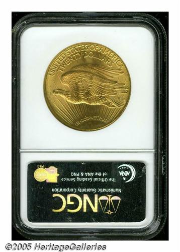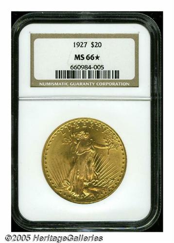 <B>1927<$20> MS66 <S NGC.</B></I> Pumpkin-gold color dominates, although pale lime hues make an occasional appearance. Vibrant luster dazzles the eye, and the devices are crisply rendered by the dies. A beautiful Double Eagle. The 1927 is acknowledged to be a 'common date,' however, it is rarely encountered above the MS66 level.