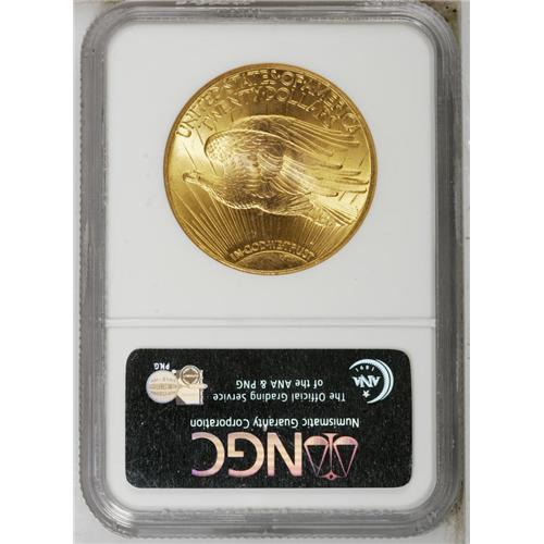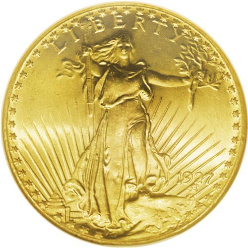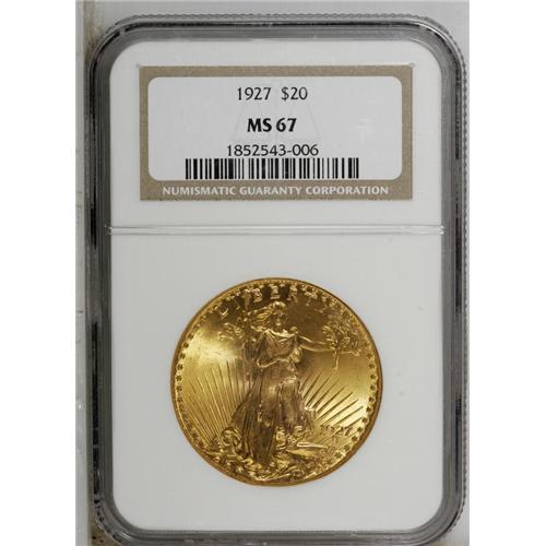 <B>1927<$20> MS67 NGC.</B></I> Although part of a commonly seen issue, this Superb Gem is anything but a common coin, in any sense of the word. The magnificent orange-golden-rose coloration combines with rich, ebullient luster to immediately captivate the eye of the viewer. The striking details are uniformly crisp and full, and careful examination with a loupe fails to reveal any noteworthy marks, other than a faint graze on the upper left quadrant of the sun. Census: 27 in 67, 0 finer (9/06).